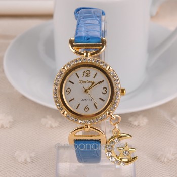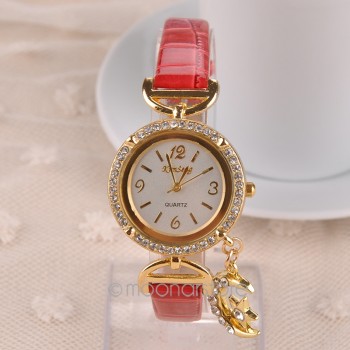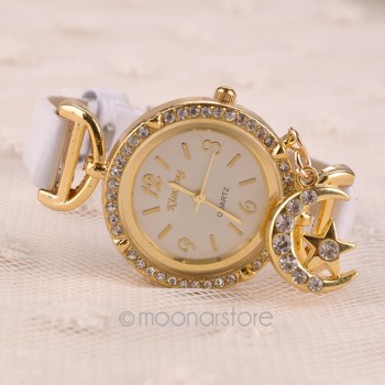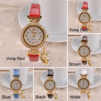 diamantes de imitación, Correa de Cuero, Reloj de pulsera de Cuarzo con La Luna Colgante para Las Mujeres